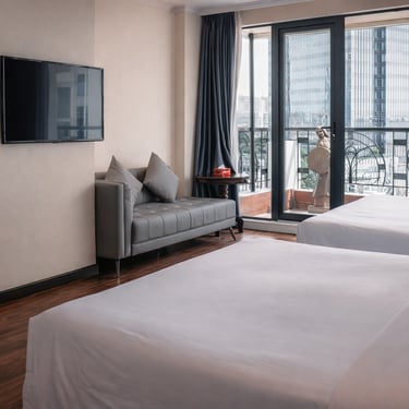 Elevate your stay to extraordinary heights in our exquisite Junior Suite. This signature room embodies grandeur and sophistication, boasting colossal space that allows you to unwind and indulge in sheer luxury. The massive window and balcony offer panoramic views of the city, immersing you in its vibrant energy. With two double beds, this suite provides the utmost comfort and opulence, creating an unforgettable experience.